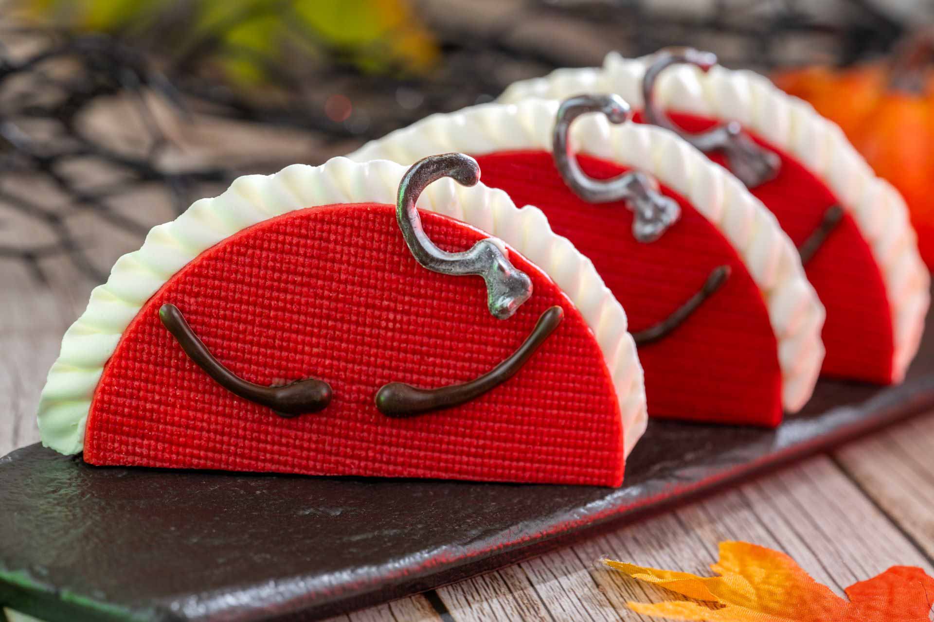 - Halloween Minnie Petite Dome: White chocolate mousse, raspberry filling, and vanilla chiffon (New)