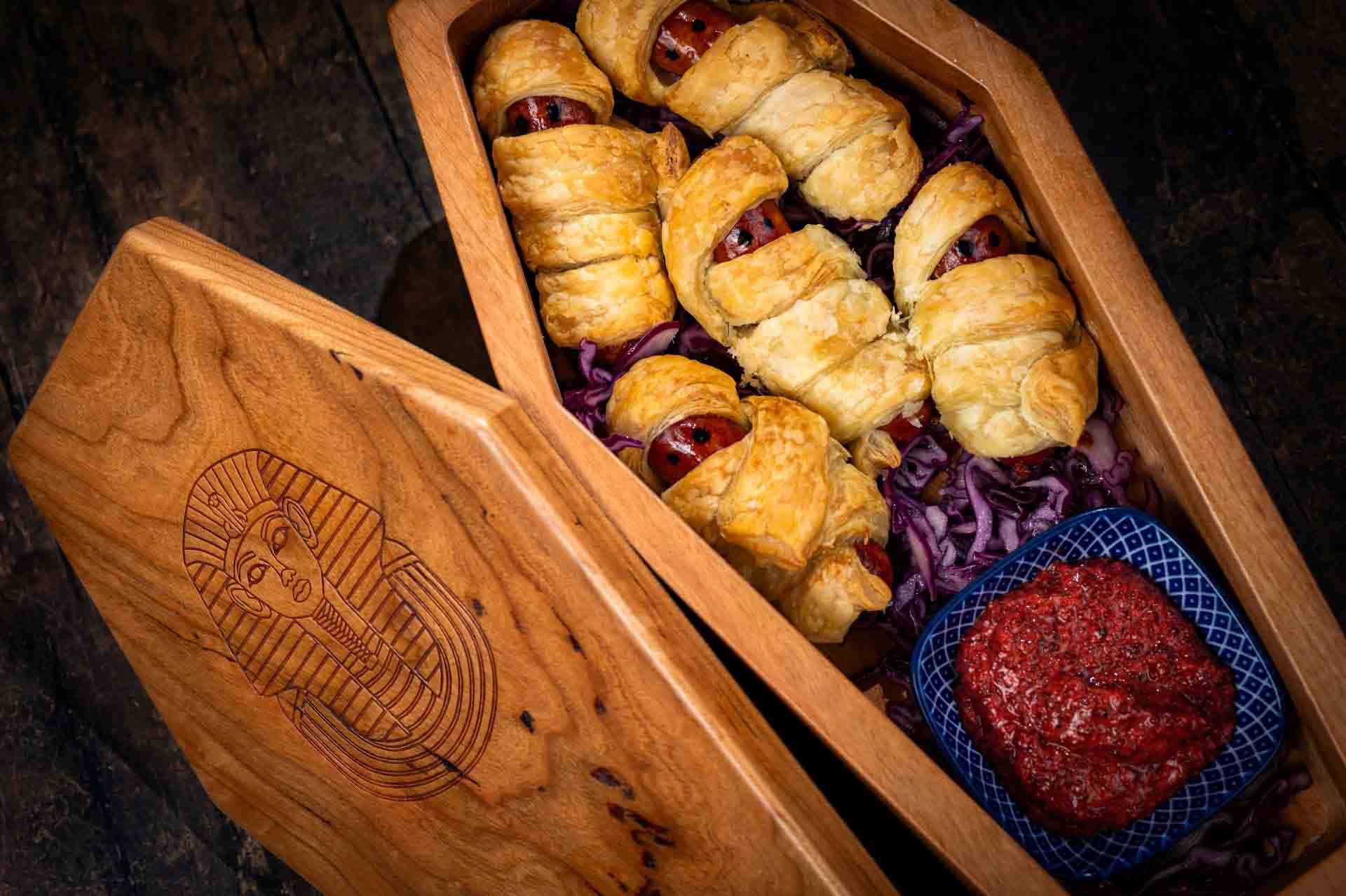 - Cursed Mummy Sausages: Mini smoked sausages wrapped in puff pastry and served with pomegranate-mustard sauce (New)