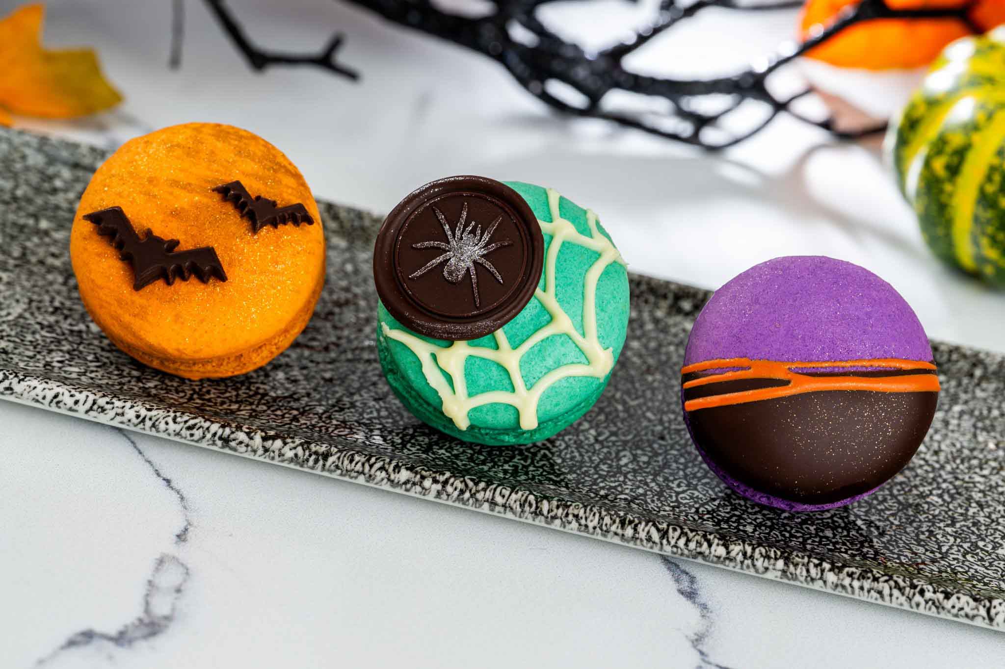 - Halloween Macaron Trio: Pumpkin-spiced milk chocolate, green apple-chocolate, and blood orange-dark chocolate