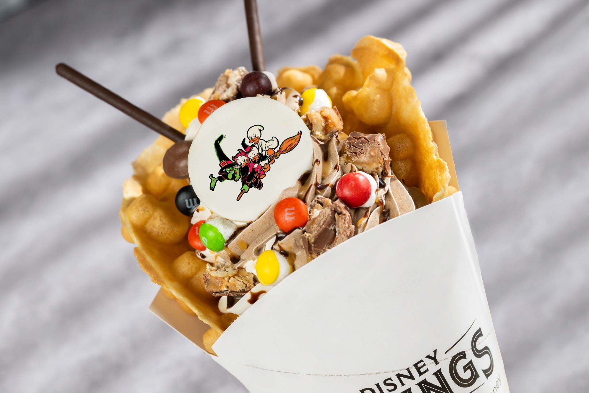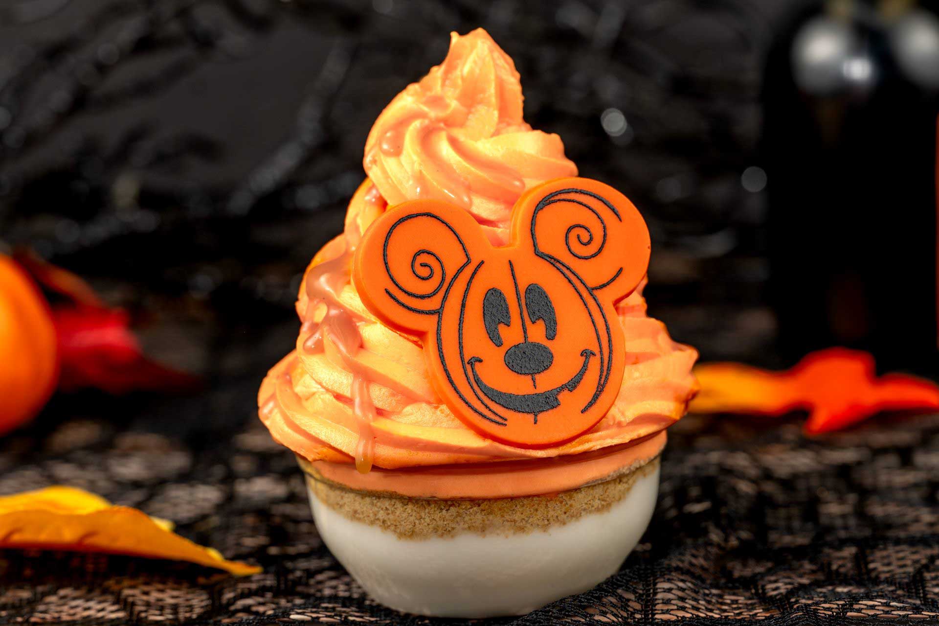 - Pumpkin Mickey Cone: Marshmallow, chocolate soft-serve, pumpkin waffle cone, Halloween sprinkles, and white cholate pieces (New)