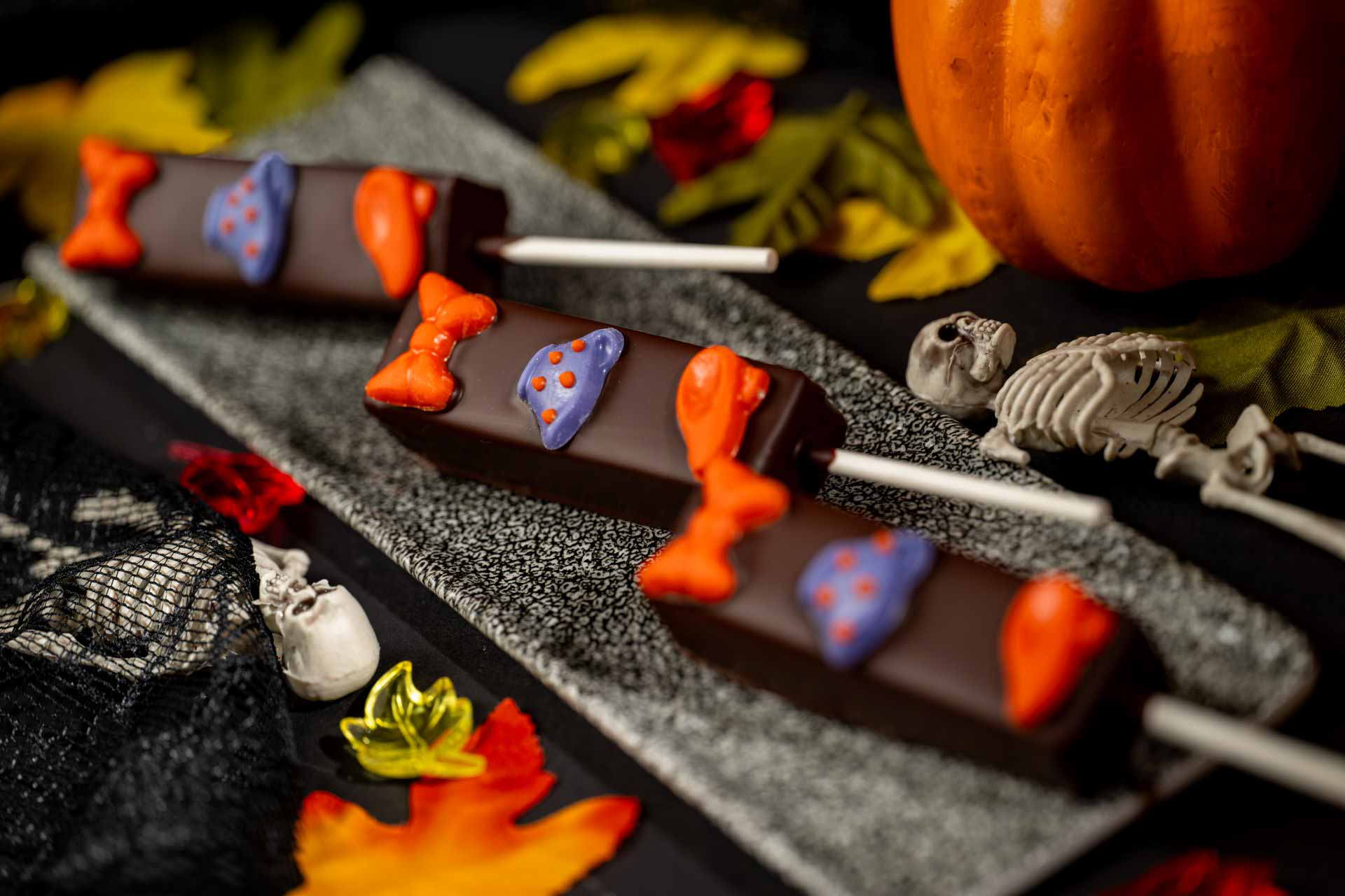 - Minnie Trick-or-Treat Chocolate Pop: Cookies and Cream Ganache Pop covered in 65% dark chocolate
