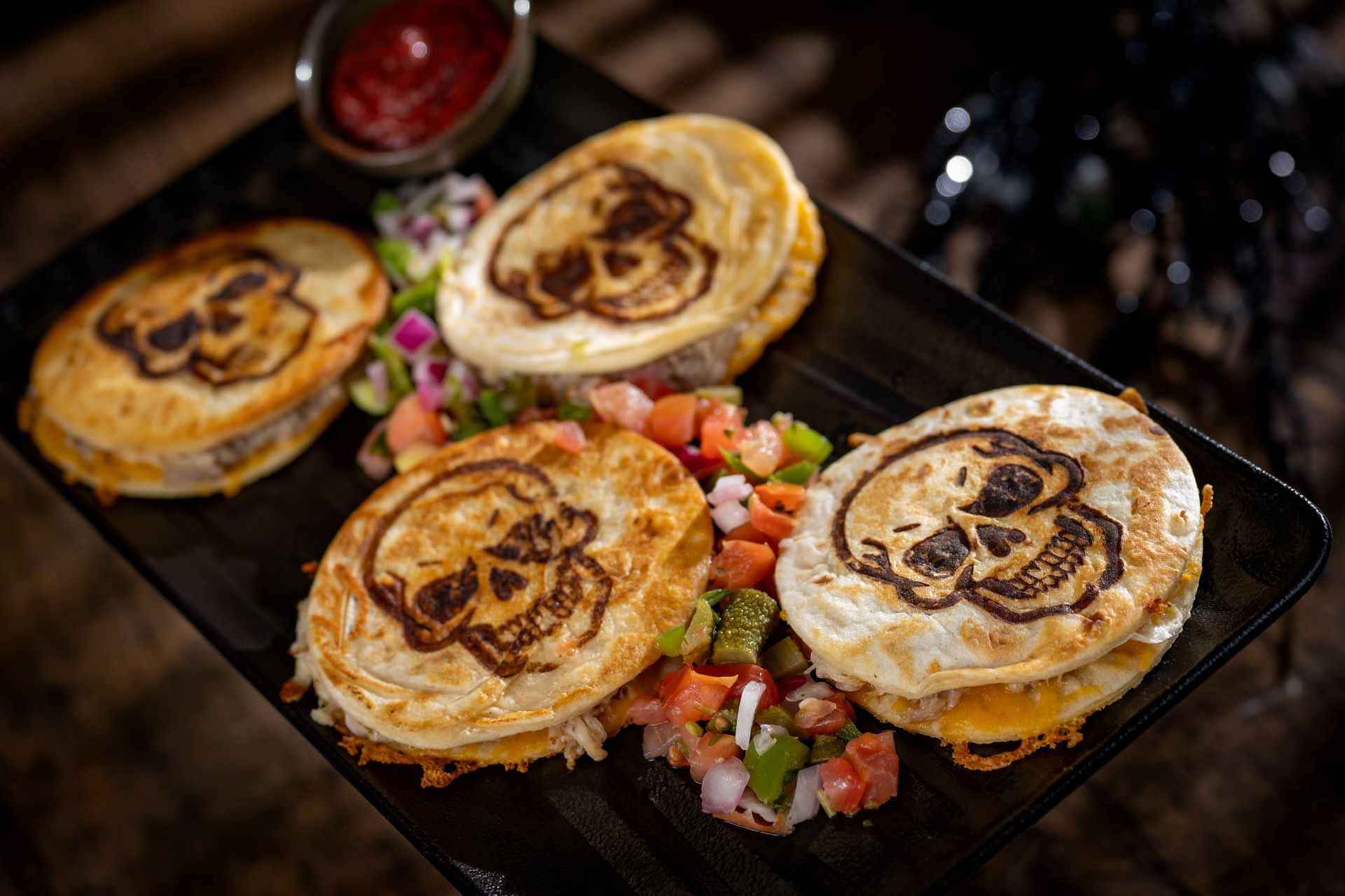 - Skull of the Dead: Mojo pork, cheddar, flour tortilla, and pickle pico de gallo (New)