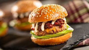 - Montreal-style Burger Slider featuring IMPOSSIBLE Beef with plant-based cheddar, tomato jam, bibb lettuce, and plant-based garlic aïoli on a sesame seed bun (Plant-based)