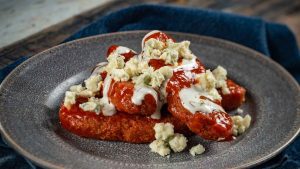 - Buffalo-style Dumplings: Chicken dumplings with buffalo sauce, celery root purée, blue cheese cream, crumbled blue cheese, shaved carrot, and micro celery (New)