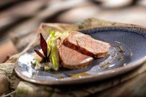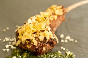 - Roasted Lamb Chop with mint pesto and crushed salt and vinegar potato chips