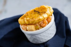 - Seaside Pot Pie with shrimp, scallops, crawfish tails, and lobster bisque topped with puff pastry (New)