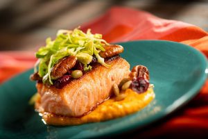 - Cast Iron-seared River Trout with vanilla-butternut squash purée, brussels sprouts salad, candied pecans, spiced pumpkin seeds, dried cranberries, and maple dressing (New)