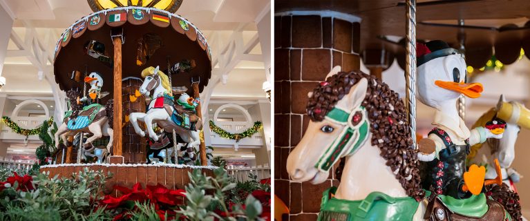 For 24 years, Disney’s Beach Club Resort has continued their cherished tradition with the life-sized Holiday Carousel. Did we mention it actually spins? Each holiday season, the horses are decorated to a different theme and this year, the characters from “Mickey’s Christmas Carol” will be brought to life by the talented Yacht and Beach Bakery. This yuletide celebration is masterfully created with chocolate, sugar, and fondant with hand-painted characters and handcrafted gingerbread shingles and snowflakes adorning the carousel.