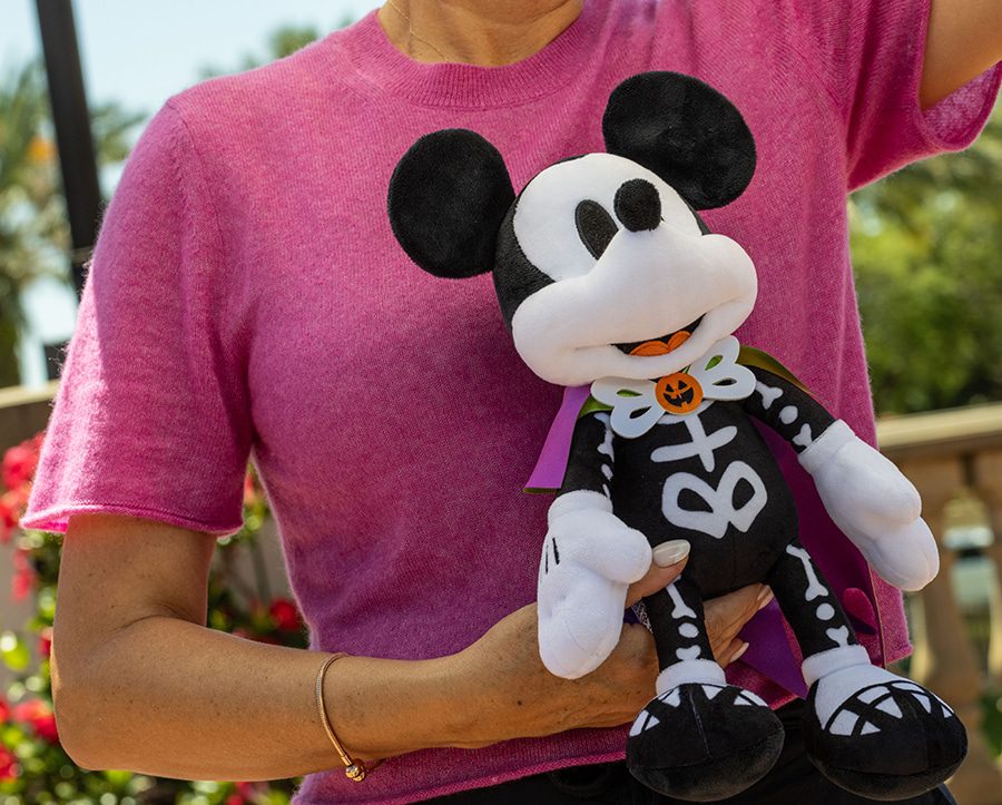 If you’re looking to bring something frightfully scary home, coming to Disney Parks and DisneyStore.com we have the iconic Mickey Mouse plush adorned as a cute skeleton.