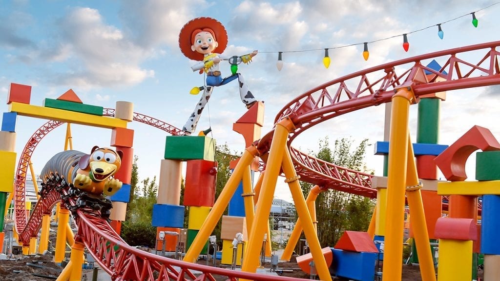 When it opens, guests visiting Toy Story Land will “shrink” to the size of a toy and join in on the fun Woody, Jessie, Buzz, and Andy’s other beloved toys are having in Andy’s backyard. Here, guests can take a ride on Slinky Dog Dash, a roller coaster Andy has assembled from his Mega Coaster Play Kit and topped off with Slinky and Jessie. (Check out the time-lapse video above of one of Slinky Dog Dash’s first test runs).