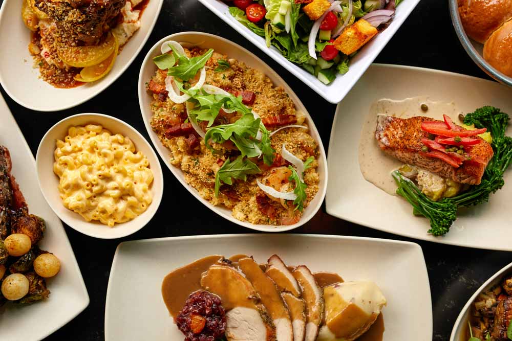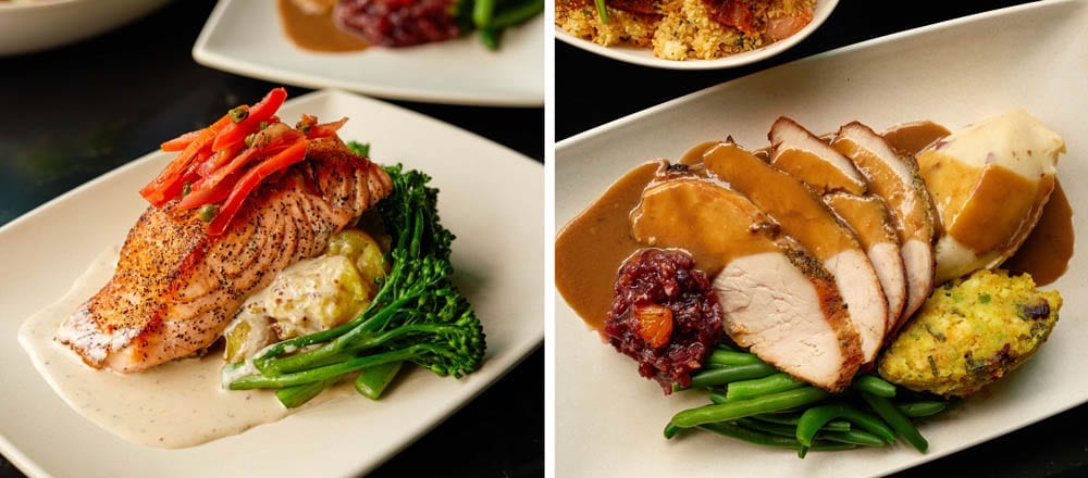 - Carved Herb-roasted Turkey Breast – Garlic-Red Skin Mashed Potatoes, Cornbread Stuffing, Sautéed Green Beans, Turkey Gravy, and Cranberry-Orange Relish.
