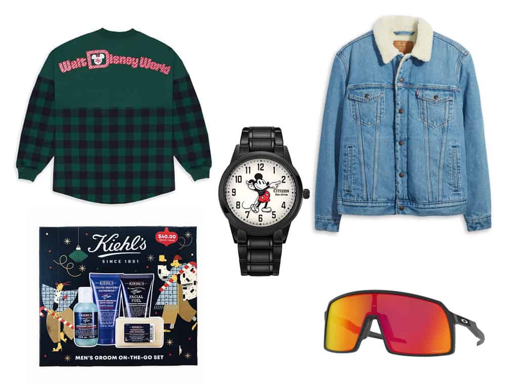 Our top 5 picks “For Him” include the Candy Cane Spirit Jersey from World of Disney, Citizen Mickey Mouse Classic Watch from Ever After Jewelry Co. & Accessories, Sherpa Trucker Jacket from Levi’s, Sutro Road Sunglasses from Oakley, and Men’s Groom-On-Go Set from Kiehl’s Since 1851.