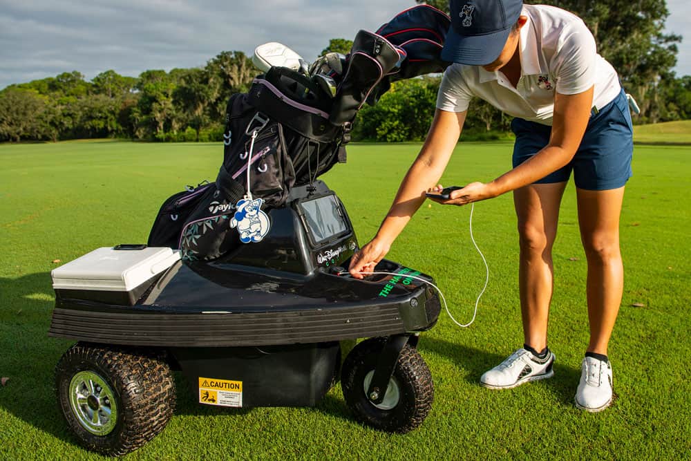 Golfers merely clip on the cart’s small transmitter (I found that attaching it to your belt behind your back works best), load your golf bag on it and then the autonomous cart follows a few paces behind you wherever you go. If you stop, the cart stops. If you start walking, the cart starts moving (max speed is approximately 7 mph).