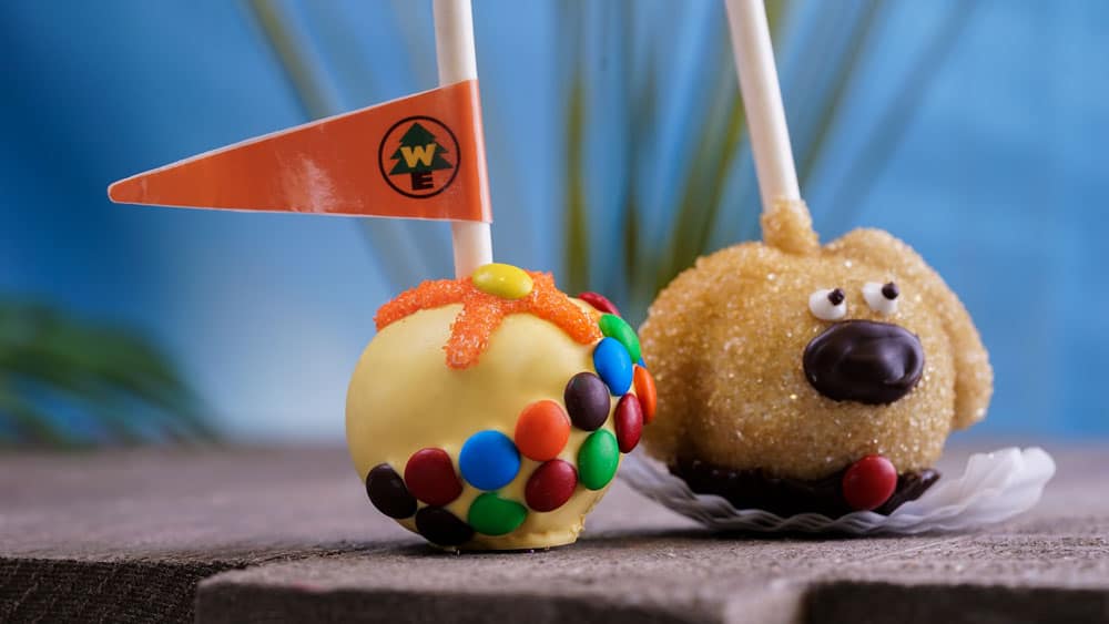 - Dug Cake Pop – Round vanilla cake pop with marshmallow ears, dipped in white chocolate, covered in gold sanding sugar, and embellished with dark and white chocolate accents