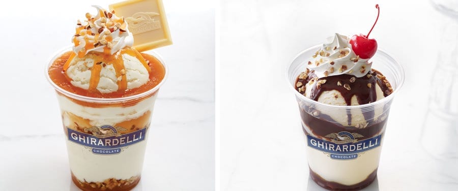 - Gold Rush Sundae – Vanilla ice cream, sea salt, diced almonds, caramel sauce, and whipped cream topped with a Ghirardelli SQUARES White Chocolate Caramel (new)