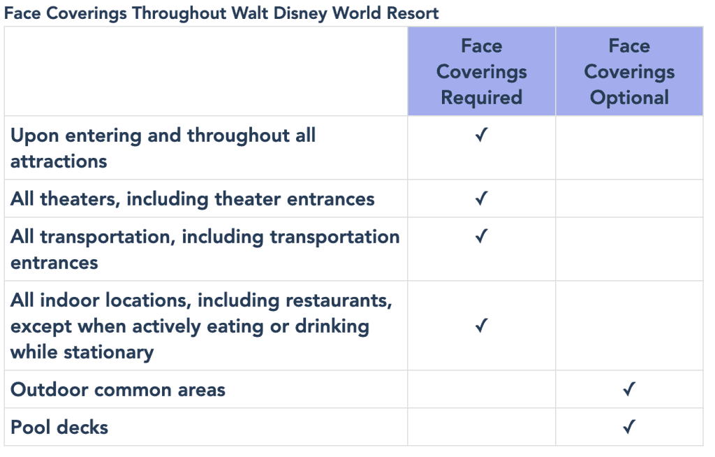 Face coverings are required for all Guests (ages 2 and up) and Cast Members. Please bring your own face coverings and wear them in all indoor locations, except when actively eating or drinking while stationary and maintaining appropriate physical distancing. Face coverings are optional in outdoor common areas at Walt Disney World Resort, but are still required upon entering and throughout all attractions, theaters and transportation.