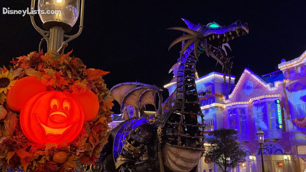 Magic Kingdom has been decorated for the fall, and we love it. After 2020’s simple decorations where a lot was missing, we’re thrilled to see the full decorations up. The fall bunting is up, and the jack-o-lanterns along Main Street USA are back. During the event, Cinderella Castle will have spooky colorful projections that will change throughout the evening. You can also find spooky projections in Tomorrowland and when you exit the park in front of Magic Kingdom Railroad station.