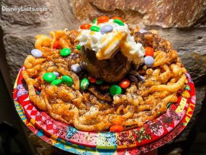 The event also offers some specialty food and beverages that are exclusive to the event. For example, at Sleepy Hollow, you can find the Foolish Mortal Funnel Cake, a funnel cake topped with chocolate cookie crumbles, purple vanilla ice cream, caramel drizzle, and M&M’s milk chocolate Ghoul’s Mix. We got this one. It was really chocolatey (so much so that I thought the ice cream was chocolate and not vanilla)! While it was fine, I wouldn’t recommend you go out of your way to purchase this one unless you love funnel cake because you can get your sweet tooth fix on the included ice cream treats that we mentioned above.