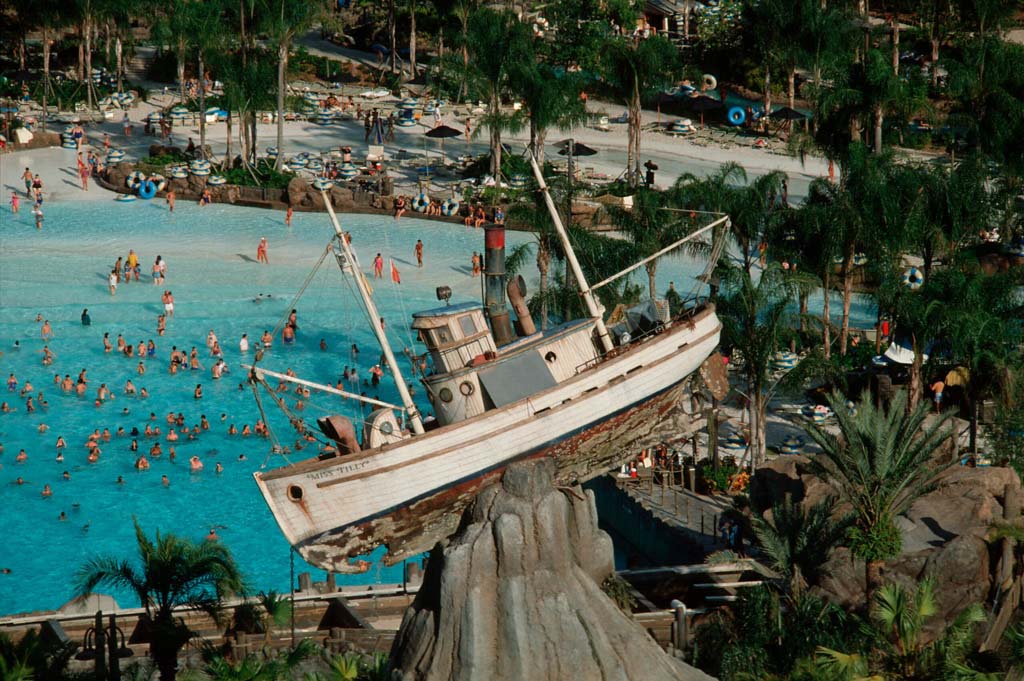Walt Disney World’s second waterpark opened on June 1, 1989, just in time for the start of summer. With new resorts and theme parks in Walt Disney World, more activities and amenities were needed for guests to engage them and keep them on property (and spending money) longer. With Michael Eisner and Frank Wells as the new leadership over the Walt Disney Company in the mid- to late-1980s came more of a focus on imaginative theming and storytelling in the theme parks. As a result, this new water park, which eased many of the crowds flocking to River Country, was rich in story and themed elements that placed guests in a particular situation. According to legend, a strong typhoon had made landfall over central Florida, destroying a beautiful lagoon in the heart of Walt Disney World. In its wake, the storm left twisted trees, surfboards scattered amongst branches, and even a shrimp boat that had been deposited atop Mount Mayday in the center of the park.