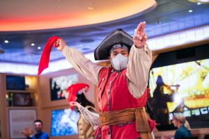 We are adding an extra dash of magic to dinner time with new entertainment in our family dining rooms. In Enchanted Garden, get ready for a high-energy celebration starring Mickey, Minnie, Donald, Goofy and Pluto. In Royal Palace (Disney Dream) and Royal Court (Disney Fantasy), you’ll have the opportunity to greet the Disney princesses as you enter the restaurant and enjoy live music during dinner. And on cruises that are four nights or longer, you’re in for a swashbuckling adventure on pirate night when rowdy buccaneers take over all of the dining rooms.