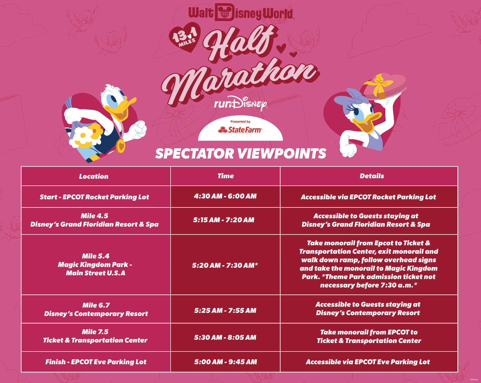 You have more viewing options for the half marathon. We recommend that once your runner leaves for the corrals, you get on the monorail and head toward Magic Kingdom so you can be ready to cheer for your runner on Main Street, U.S.A. Spectators do not need to pay for park admission to enter Magic Kingdom.