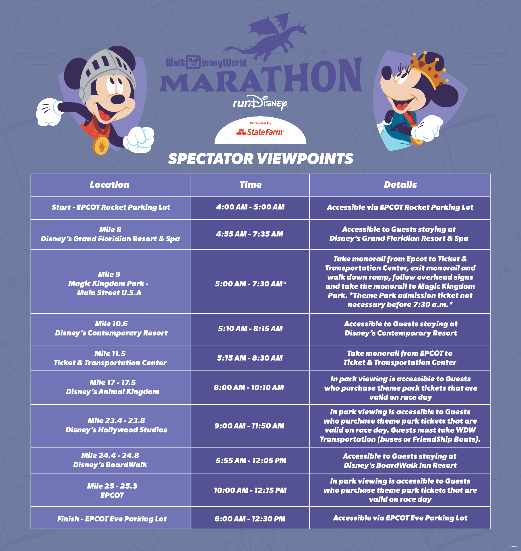 Marathon spectators have a lot of options. You need to decide what other areas you will attempt to get to. Keep in mind that with road closures, there will be delays in getting to other areas on property. Animal Kingdom is probably the hardest park to get in and out of due to the road closures. Note that while you do not need park admission for Magic Kingdom (before 7:30 am), you will need valid park admission for the other parks because the park is open to the public by the time the runners are at those parks. Consider that when deciding where you will try to meet your runner.
