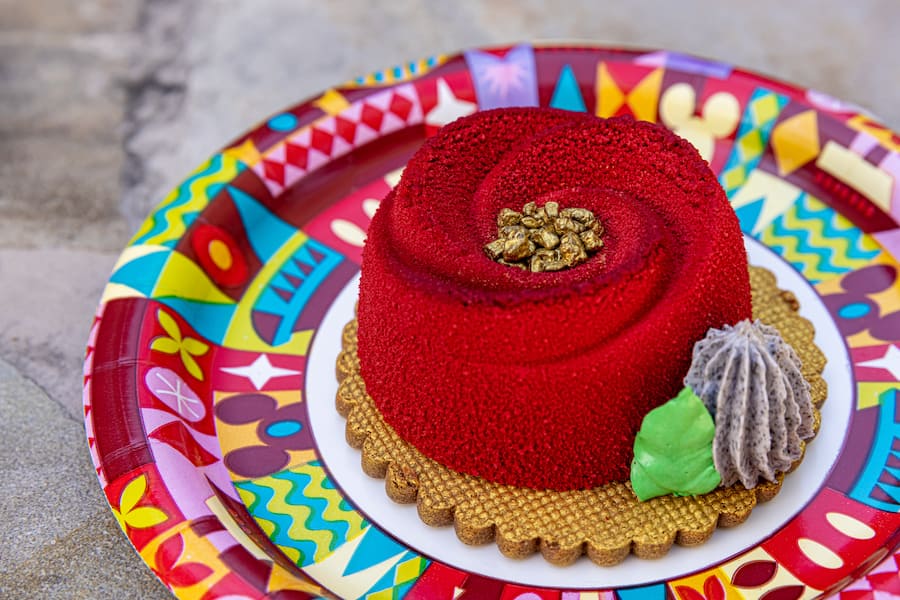 • Enchanted Rose: Dark chocolate, blackcurrant, and morello cherry mousse with whipped cookies ‘n cream fluff, and gilded chocolate-covered cacao nibs on a shortbread cookie