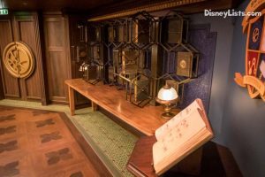 Royal Palace décor includes a hand-blown centerpiece chandelier with glass slippers accents, luxurious custom carpeting with a pattern of flourishing roses, and ornate marble floors—including a “family crest” of inlay featuring a tiara crown, a glass slipper, rose, and apple. The Royal Palace’s circular floor plan, fluted columns, and iron railing work are recreated from the “Cinderella” ballroom scene. Wall sconces are fashioned after those in “Beauty and the Beast.” Hand-crafted mosaic tile murals of the princesses—Cinderella, Snow White, Belle, and Sleeping Beauty (Aurora) —and their princes grace the far wall.