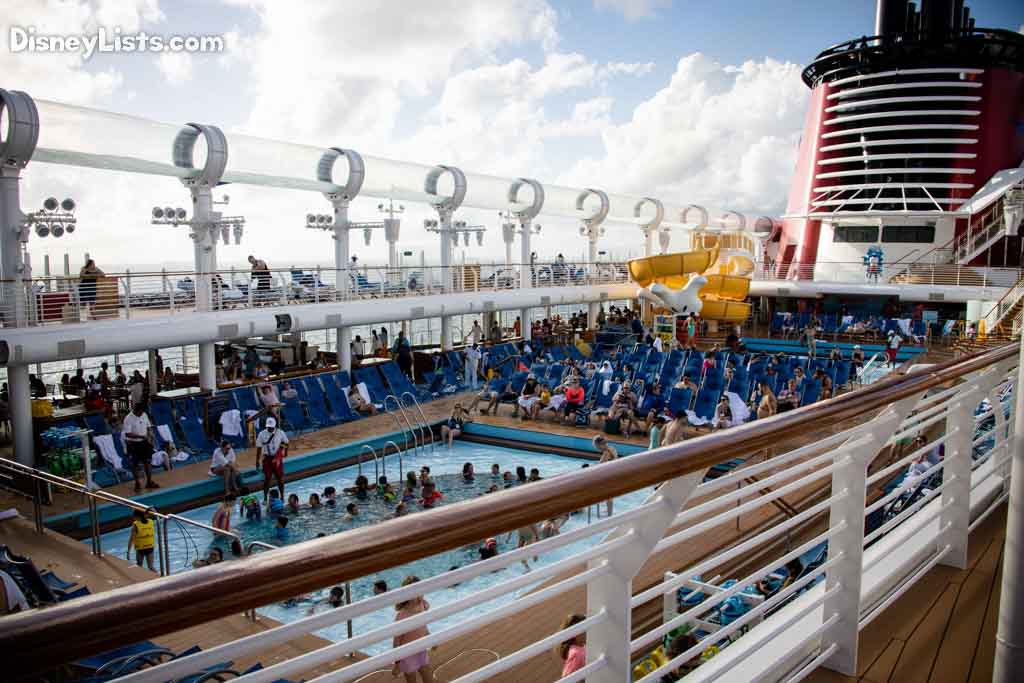 - Mickey’s Pool for children continues a Disney Cruise Line favorite feature. An oversized version of Mickey’s hand supports a yellow winding slide that splashes down near the pool.