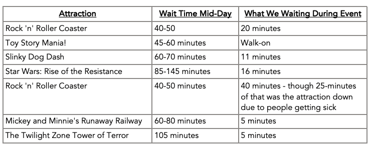 So, if we had to wait in line for each of the attractions we rode during the event, based on the wait times above, we would have waited in line for 10 hours. Realistically, we wouldn’t have been able to actually ride all of those because once you factor in the time needed to ride the attraction, eat meals, etc. There isn’t enough time in the day to wait for these attractions and ride them all. Even with the help of Genie+ and a Lightning Lane for Rise, it would be challenging to ride all the ones we did.