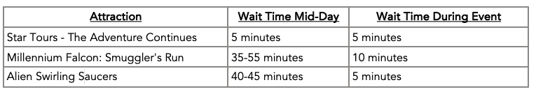 As you can see, wait times during the event are very low, especially when compared to what they are during the day. And they can be even better than what is posted. More often than not, the wait times are lower than what is posted during the event. For example, when I got in line for the Tower of Terror, the wait time posted was 35 minutes. I only waited five minutes. Don’t be put off by wait times during the event. And even if I had to wait 35 minutes during the event, that is much better than 105 minutes during the day.