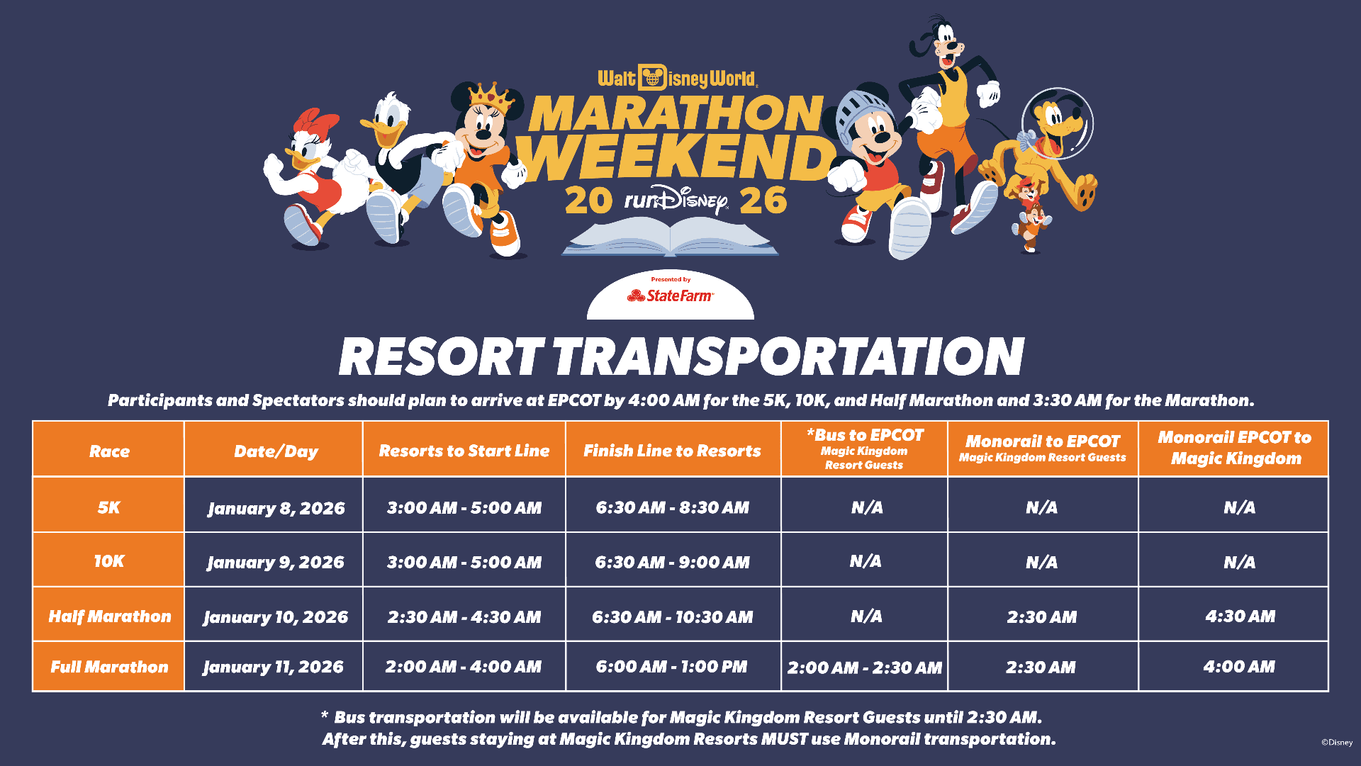 For those taking Ride Share please follow the signs to the designated Ride Share Drop Off area. Athletes and spectators for all races should arrive at EPCOT by 4:00 am. Please note that EPCOT Toll Plaza via World Drive North is open all four race days, and a parking fee is not charged before 6:00 am.