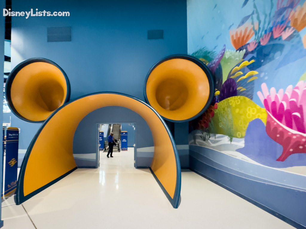 The new cruise terminal is perfectly themed to the Disney and Pixar’s film, “Finding Nemo.” Favorite friends from the film are displayed on colorful murals. The more than 104,000-square foot terminal was reimagined by Walt Disney Imagineering exclusively for Disney Cruise Line guests to provide a seamless embarkation experience. The terminal also has plenty of fun photo backdrops for photos.