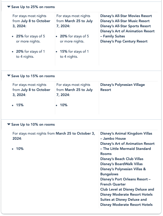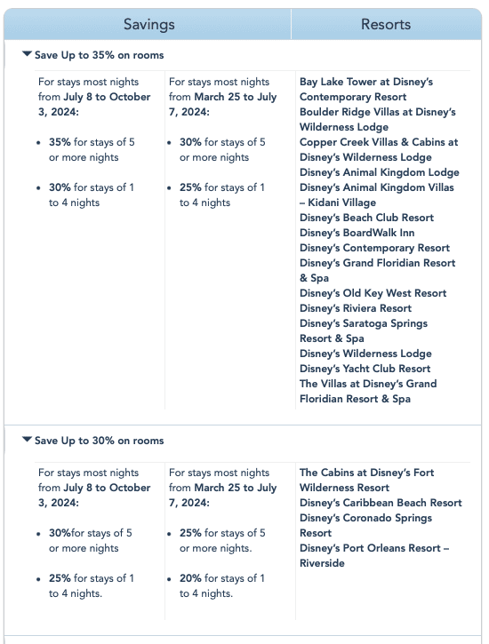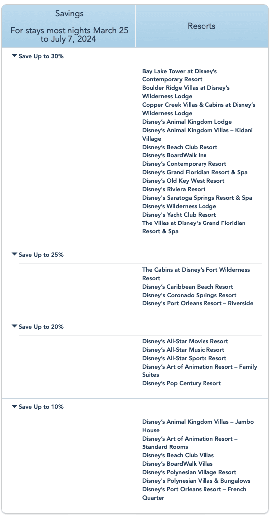 This offer is valid for the Disney Resort hotels listed below. View the chart to explore savings.