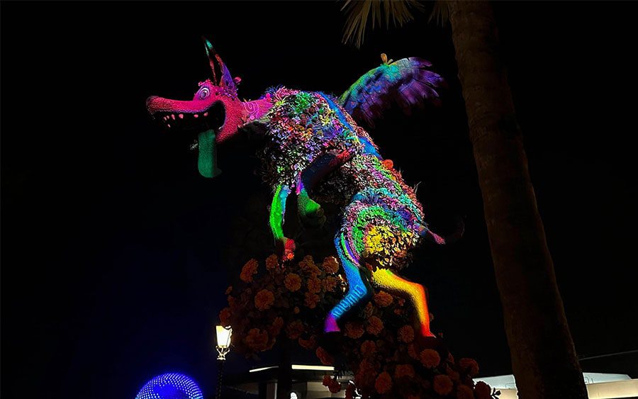 “With the bright and vibrant colors we see from this realm in ‘Coco,’ it seemed like an obvious choice when Josh and Brittany proposed the idea of using projection mapping technology to enhance Dante’s look during the evening hours,” added Steven.