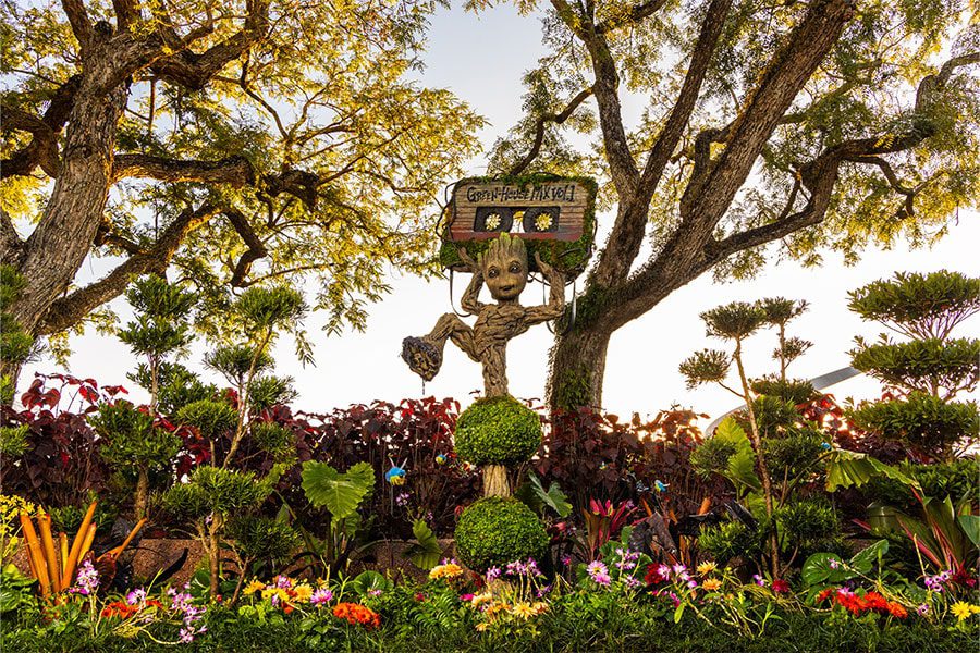 In true Guardians of the Galaxy fashion, Groot is holding a dynamic mix tape titled “Green House Mix Vol. 1” with his own soundtrack playing — it’s the first time a musical element has been incorporated into a topiary at EPCOT!