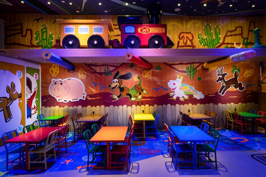 Andy has created a new rodeo arena for all of his favorite toys, featuring game pieces and iconic “Toy Story” characters, stickers, and more. Imagineers worked closely with Disney Pixar Animation Studios to bring the space to life, developing unique designs and artwork that can only be found in the restaurant.