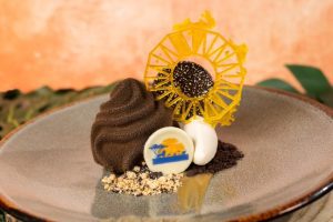 The Remember Who You Are at Tiffins Restaurant is Kenyan coffee mousse filled with caramelized bananas, chai chantilly, banana-caramel sauce, chocolate-coffee crumble, chocolate decoration, and a sugar sun.