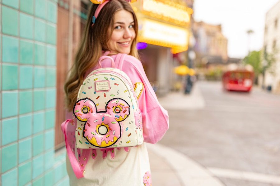 And who doesn’t need a Loungefly to add the perfect sprinkle of contrast to tie it all together? The pink frosted donut even pops off the white rainbow print in the shape of a hidden Mickey Mouse!