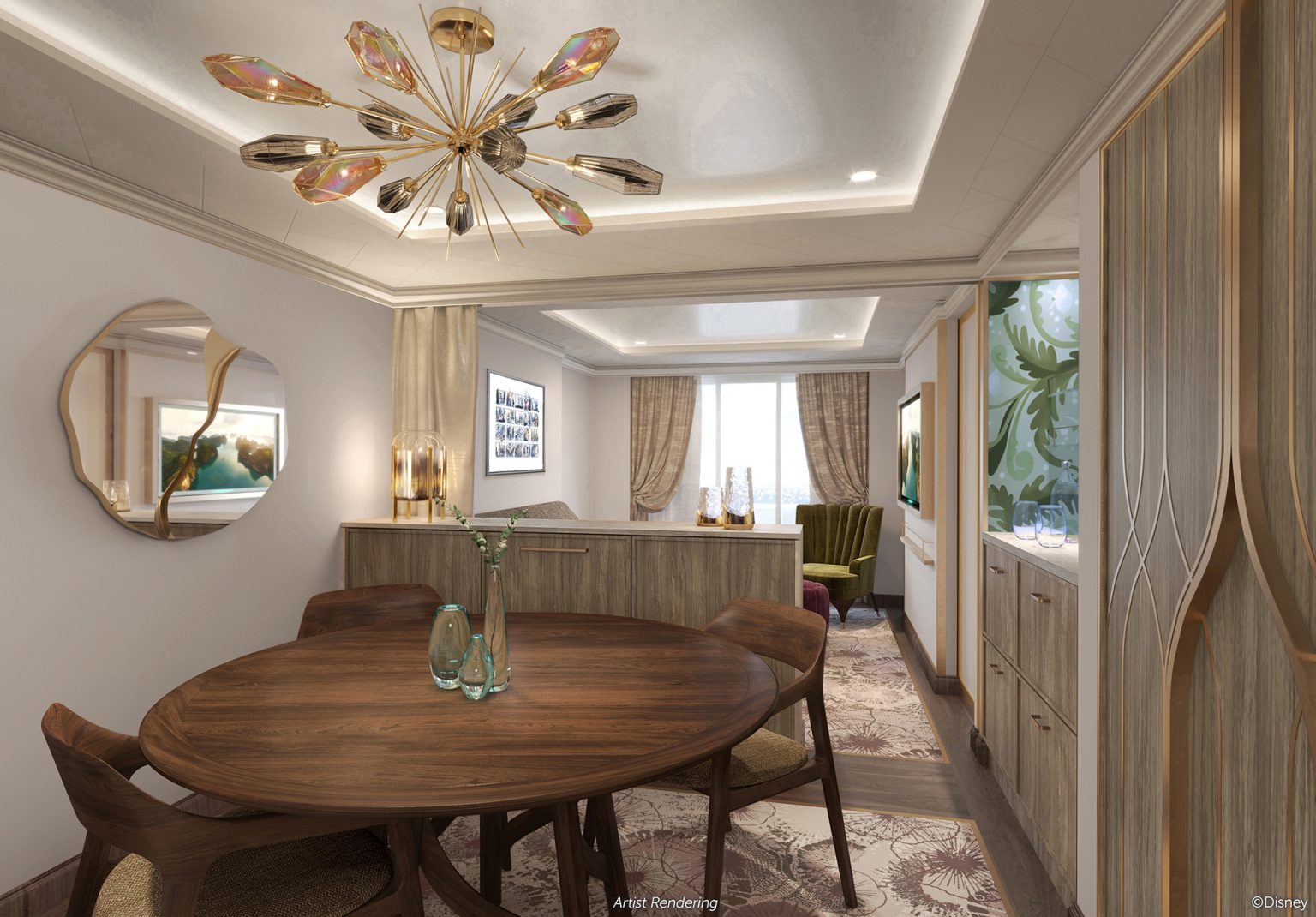 Keeping with the ship’s unique theme, every stateroom and suite will showcase custom artwork depicting the epic journeys of famous Disney legends.