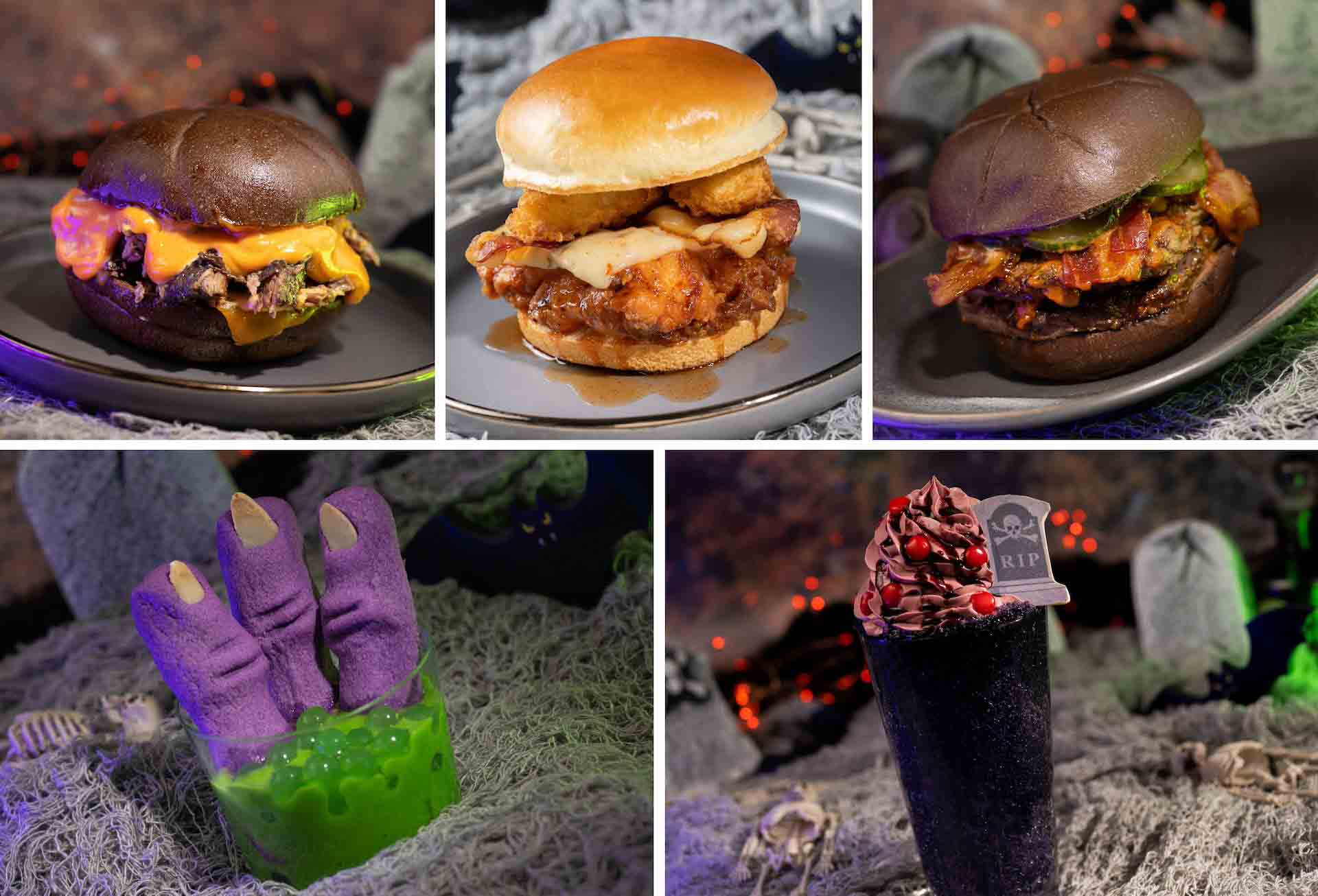 -  - Ghoulishly Gourmet Burger: Two all-beef patties with pepper jack and Swiss cheese, candied bacon, balsamic-glazed mushrooms, onion ring, and truffle-buffalo aïoli served on a black bun (New) (Available during regular park hours and Mickey’s Not-So-Scary Halloween Party)