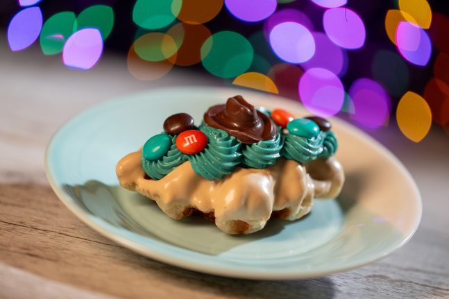 - Agent P Croissant: Waffle croissant dipped in caramel-chocolate and topped with mint cream, a chocolate hat, and M&M’S Milk Chocolate Candies (New)