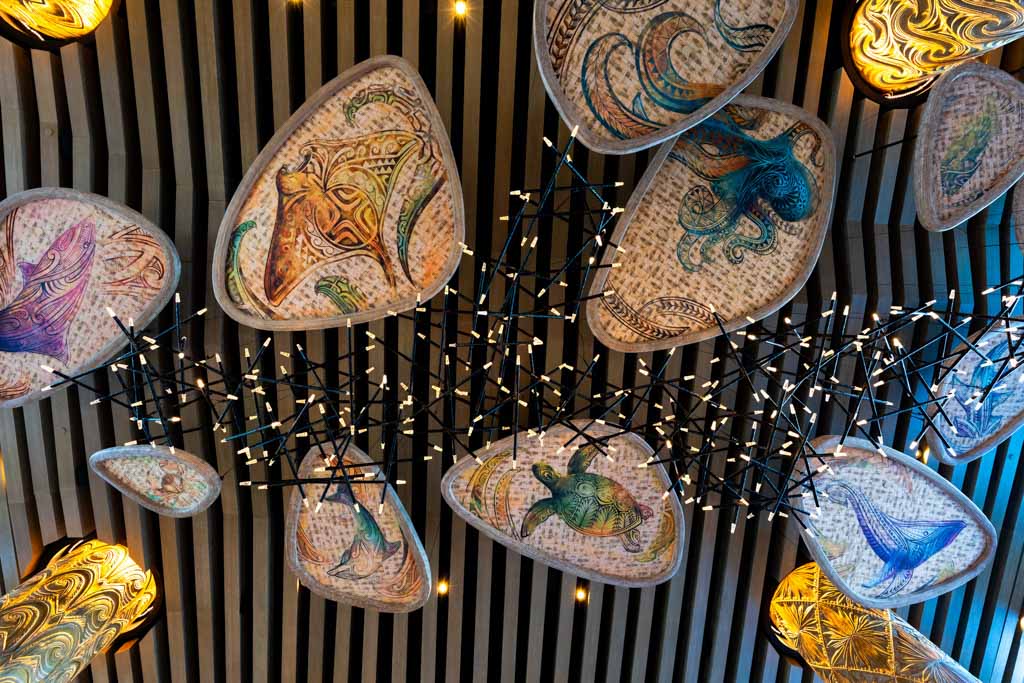 One of my favorite spaces to visit was the lobby. The space features a variety of artists from around the world to create a unique experience rooted in Polynesian heritage. The four pillars represent the elements: earth, wind, water, and fire. Be sure to look up because you’ll see sea animals above you. There are many windows to connect you to the outdoors. Finally, there is a beautiful three-story mural of sea life with touches of Moana throughout, such as Gramma Tala’s manta ray, Maui, Te Fiti, and Tamatoa. The mural was crafted from organic materials native to the Polynesian island and was designed by Maria Apelo Cruz. It really is an amazing addition to the lobby and it’s worth the time to visit just to see the mural.