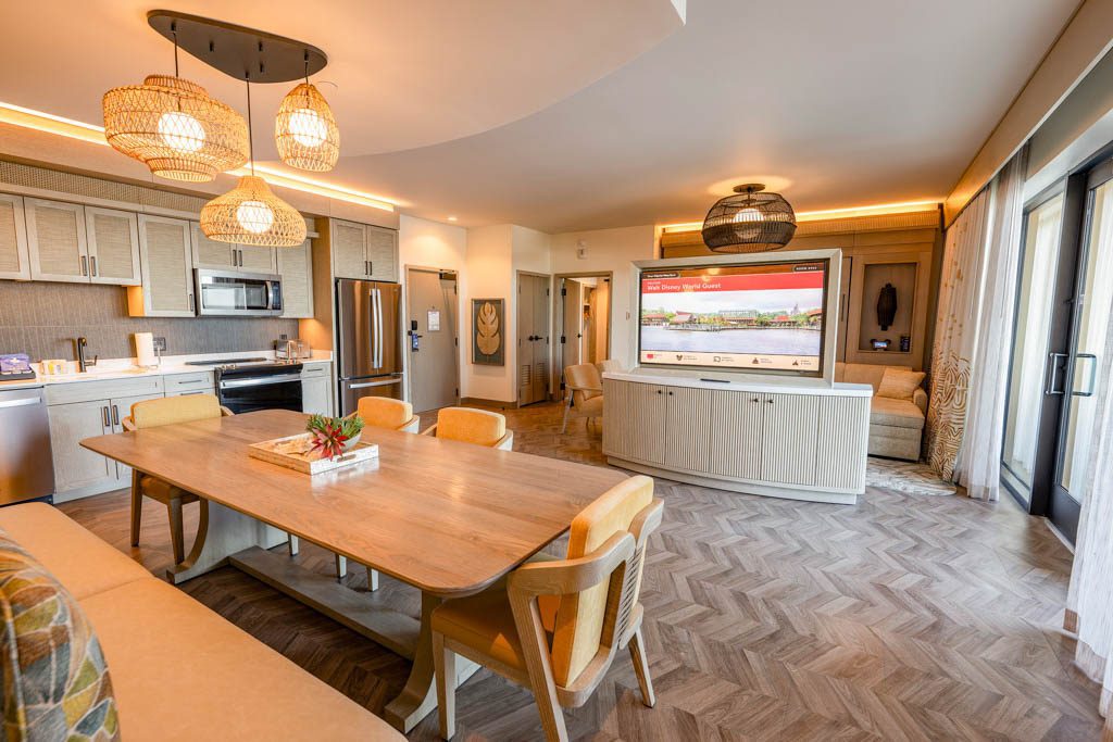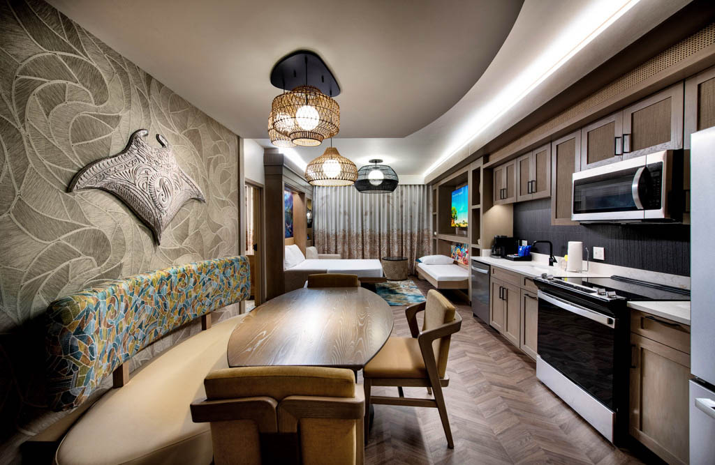 One- and two-bedroom villas are themed to the beauty of water or Moana’s love for nature and sleep five and nine guests, respectively. The villas include a full-size kitchen, dining area, and living area with sofa seating that can be easily pulled down to reveal a queen-size bed and a story-themed mural inspired by Moana sailing on her canoe to retrieve the heart of Te Fiti. These rooms also include two bathrooms, a primary bedroom, and a washer and dryer, which are staples of Disney Vacation Club villas.