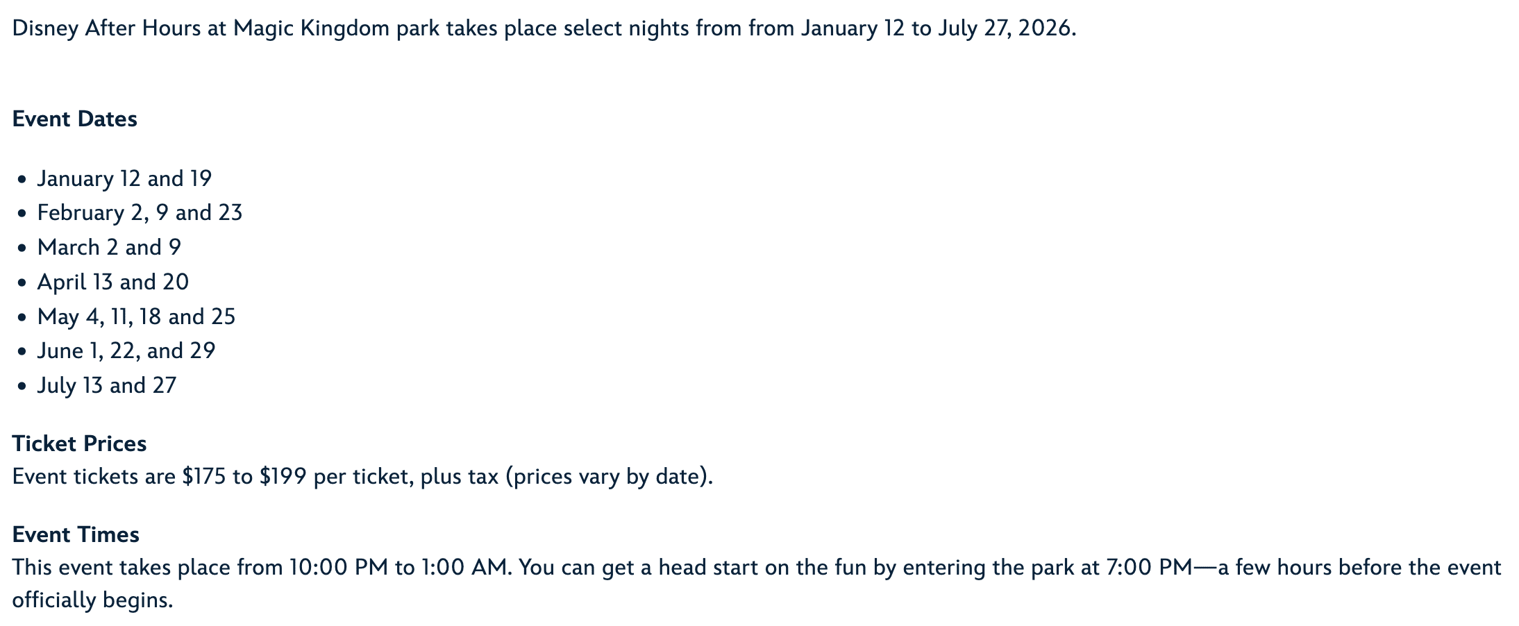 In 2026, the Disney After Hours events run from January through July 2026. Unlike Hollywood Studios and EPCOT, you won’t find dates in the summer or early fall. See below for the dates of the events in 2026