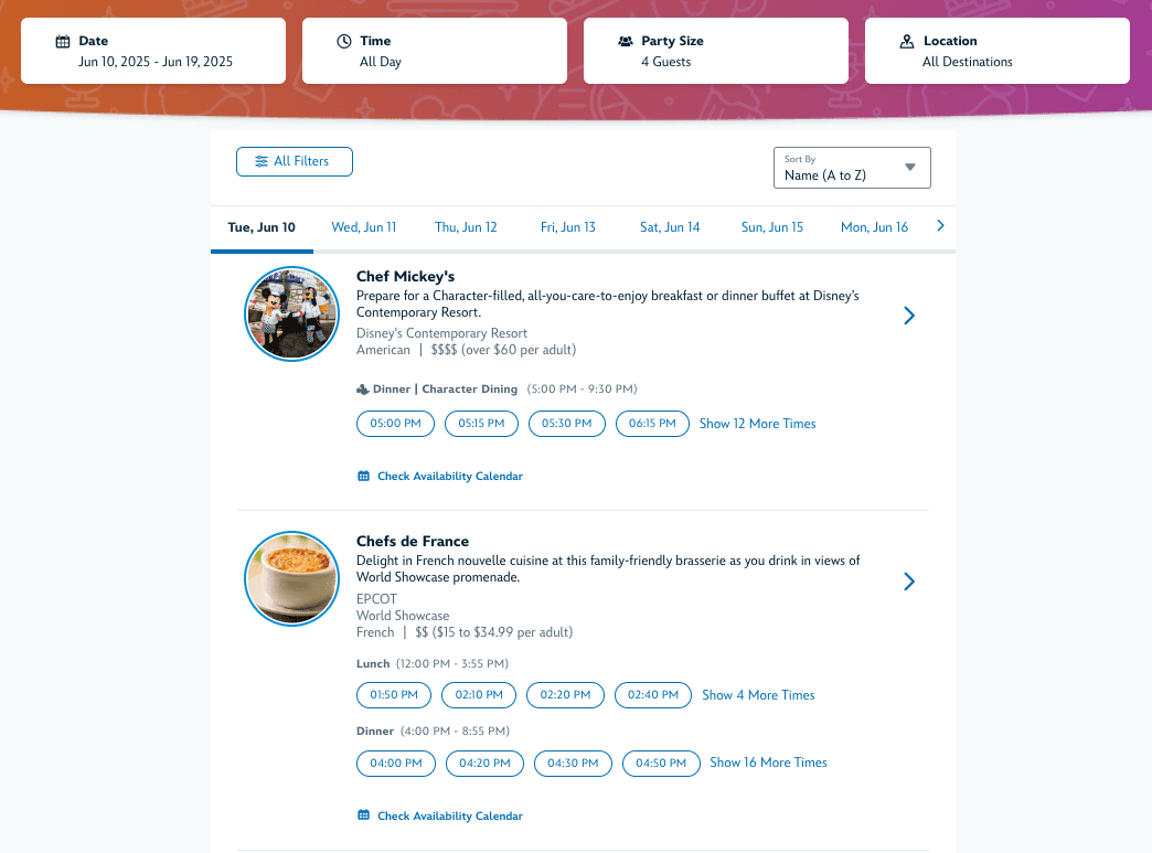 - New filters and labels: For guests looking for something specific, our search function will have new features that let you filter by location, meal type (breakfast, brunch, lunch, and dinner), and for our Walt Disney World guests, by Disney dining plans. It’s also easier to see which dining reservations offer Disney character dining experiences.