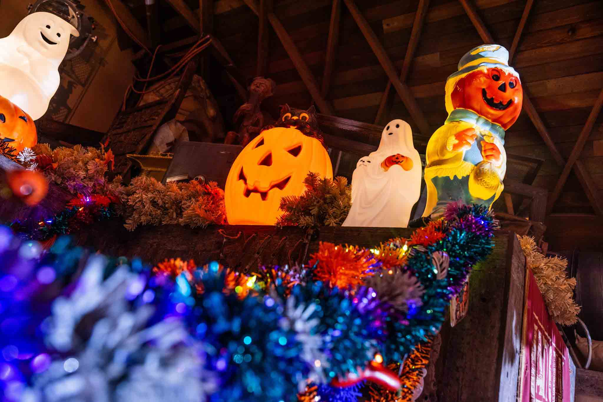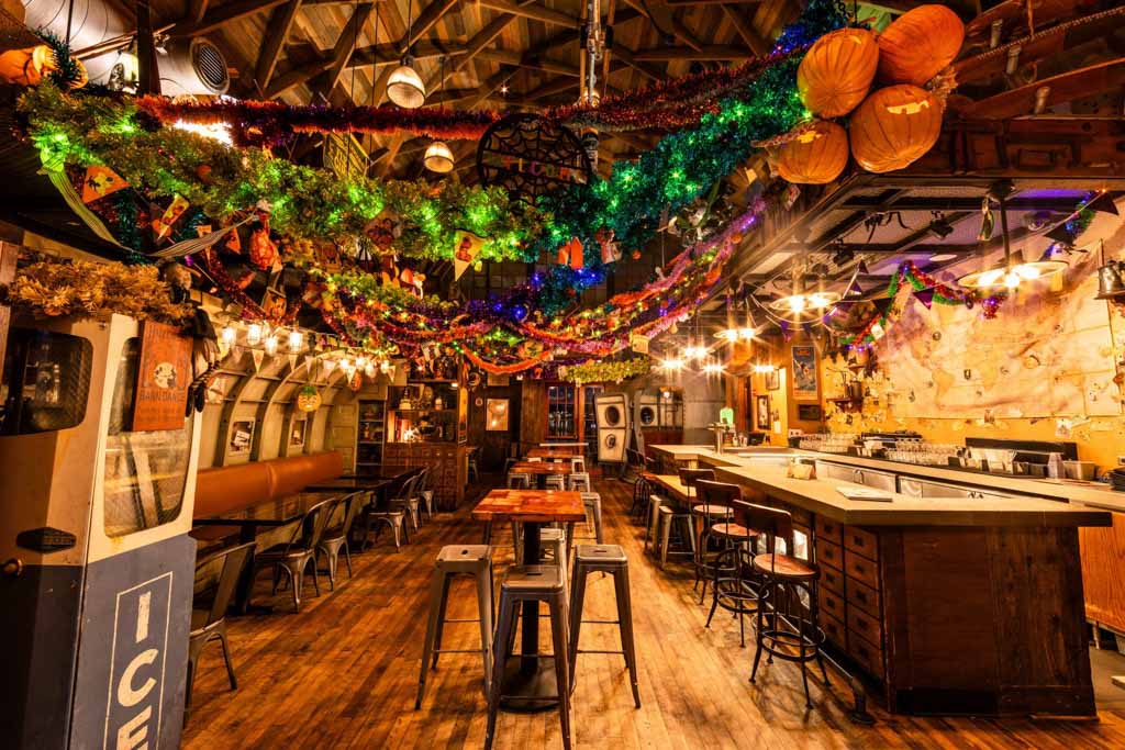 Jock Lindsey’s Hangar Bar transforms into a warm and inviting retreat during Halloween, blending the cozy glow of vintage lanterns with playful touches that feel more charming than chilling.