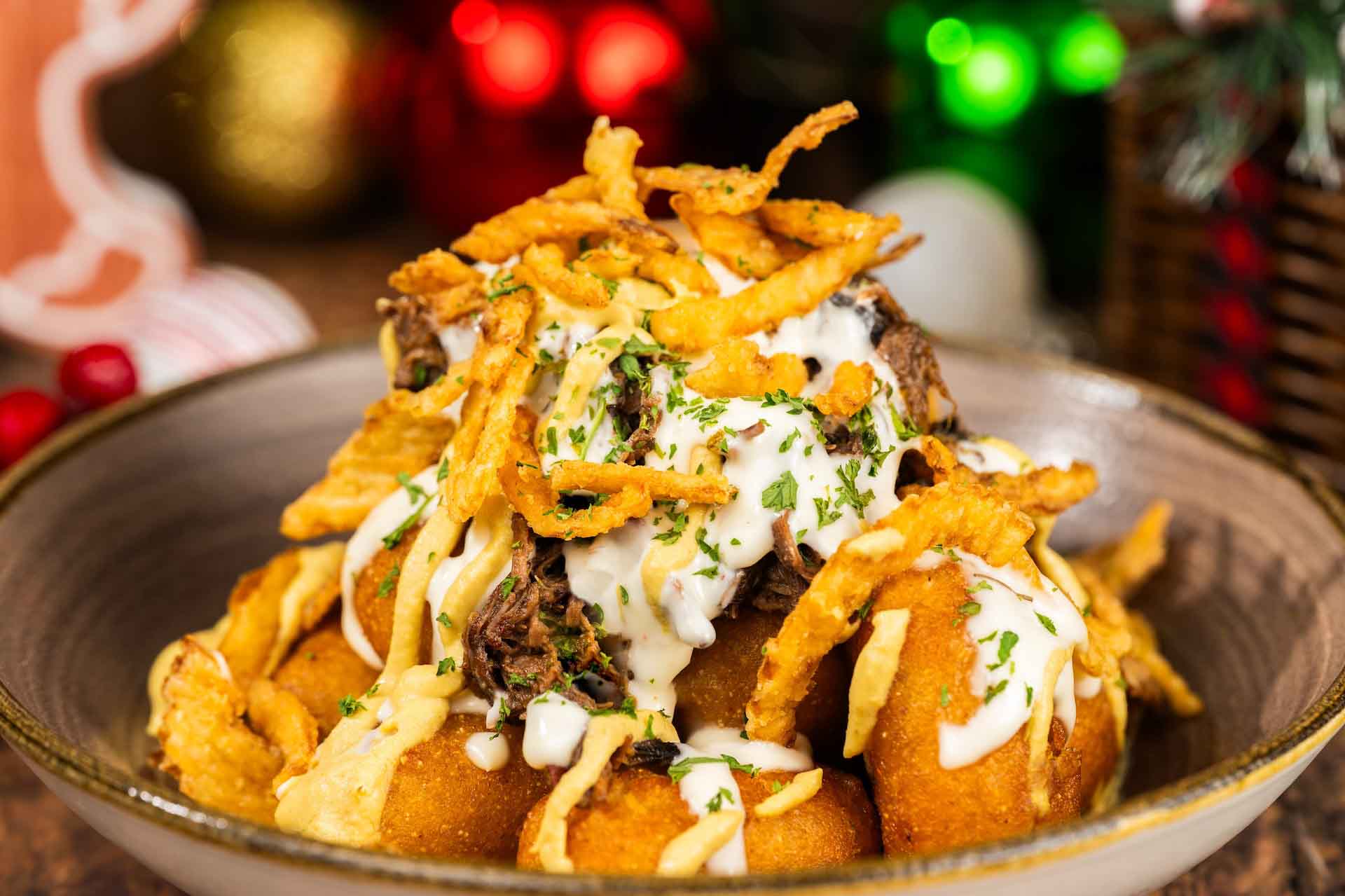 - Holiday Pot Roast Loaded French Fries topped with pot roast, beer-cheese sauce, crispy onions, and horseradish mustard (Available during Mickey’s Very Merry Christmas Party only)(New)
