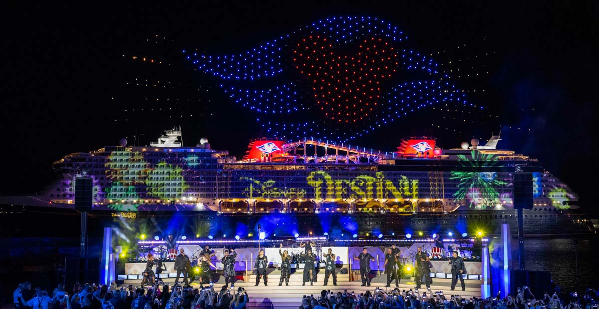 The Disney Destiny Christening combined the spirit of a high-energy concert with the theatricality of a Disney spectacular, including a multi-tiered set, drone special effects, and scenic projections on the ship itself, alongside a live band and a dozen dazzling vocal performers. Learn about the special ceremony below!