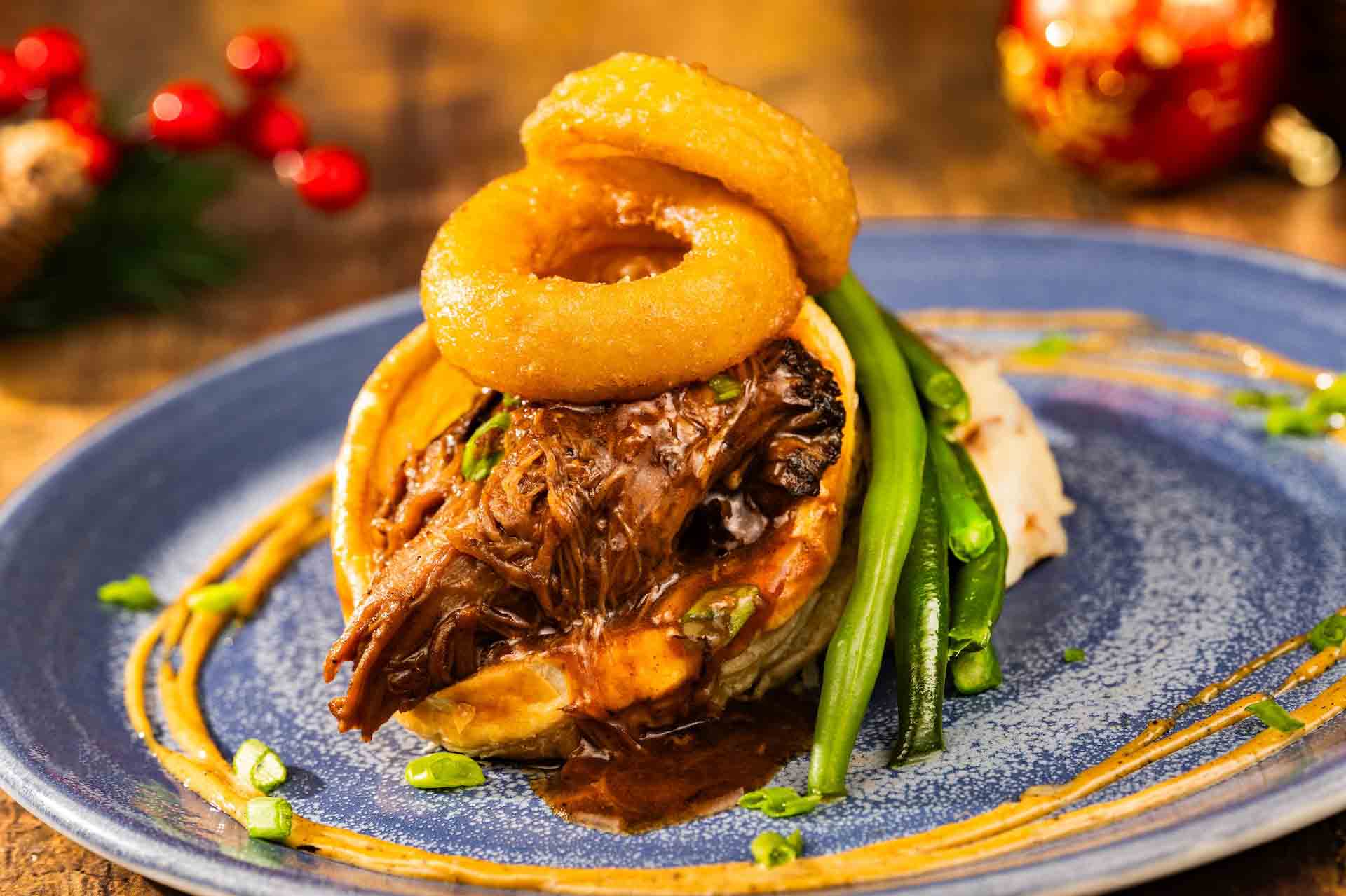 • Holiday Beef Pot Roast: Served in a puff pastry crust with mashed potatoes, beer-battered onion rings, and black garlic-truffle aïoli (New)